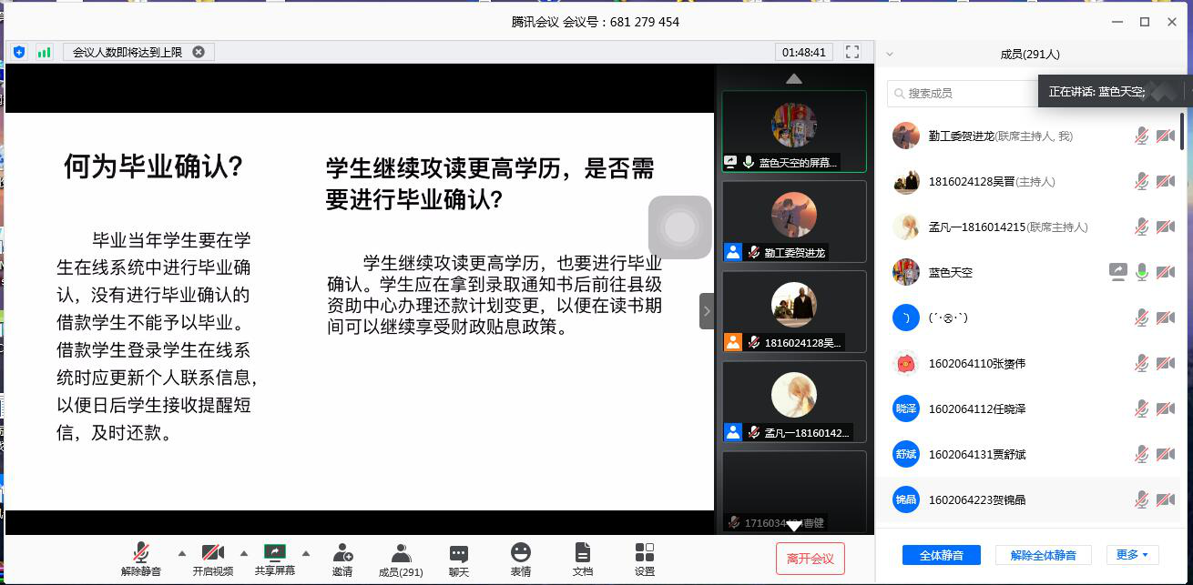 随后李清岩老师为同学们详细讲解了助学贷款的还款事宜,并在讲解结束后与同学们交流疑问所在,同学们也表示在今后的无论是大学生活还是投身社会工作中都端正态度,不忘初心,砥砺前行。同时也为同学们送出了:“乾坤未定,你我皆是黑马”的祝福。至此本次大会圆满结束。
