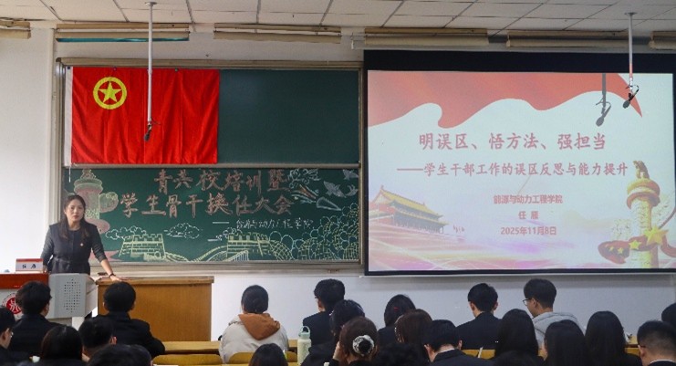 在08201H教室隆重举行2025-2026学年青共校培训开班典礼暨学生骨干换任大会。院党委书记胡向明、院党委副书记兼副院长任雁、院团委书记李晓彧、辅导员祁亚萍出席活动,韩国色情
