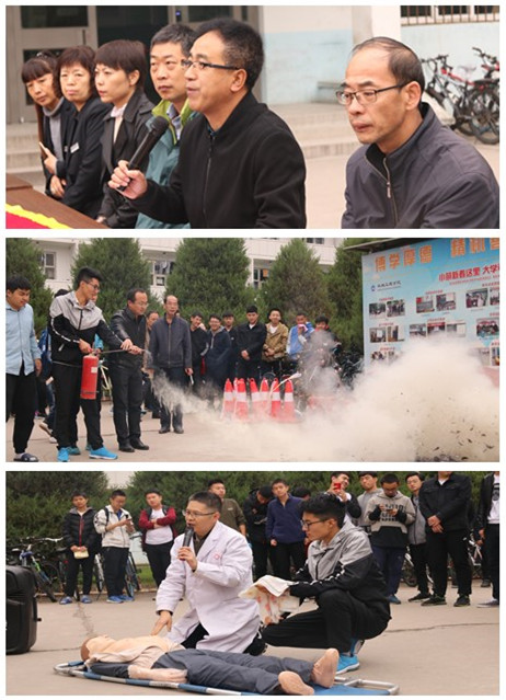 演习开始,同学们在预警声中,紧急而有序的到达指定的集合地点。在苟虎平医生的亲自指导下,同学们详细了解了急救知识,并且进行了急救示范。随后史老师为大家讲解灭火器的使用方法,与同学们合作完成现场的火灾急救全过程。演习过程中师生积极配合参与,通过理论与实践相结合,同学们更深刻了解到急救现场的相关知识。演习最后,李书记就此次消防演练做了总结并强调安全是教育永不变的主题。