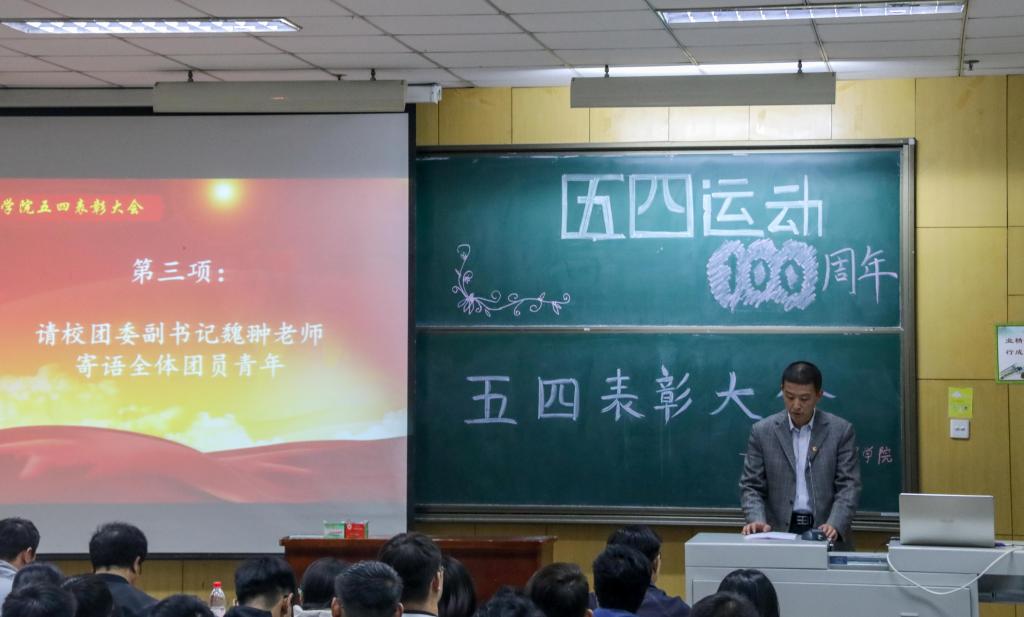 于5月10日在11109教室举办了纪念五四运动100周年暨建团97周年表彰大会。出席本次活动的嘉宾有校团委副书记魏翀、院党委书记李运芝、院学生科科长叶增民、院团委书记李晓彧、学生科辅导员乔洋以及研究生辅导员杨勇、唐金保。院团委学生会部长级以上学生干部、所有团委学生会后备、获奖集体及个人、17与18级各团支部代表也参与了此次大会。