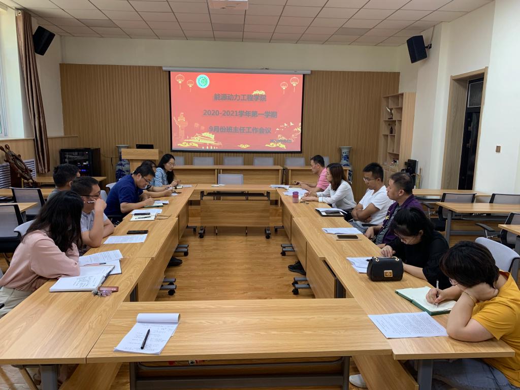 于诚学楼一层会议室召开2020-2021学年9月份班主任工作会议,全院辅导员、各班班主任一同参加。