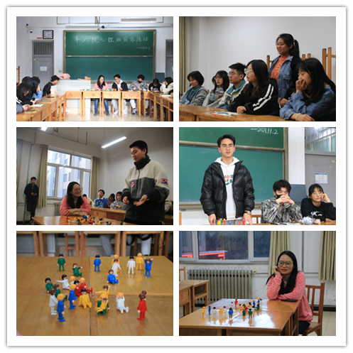 首先,热身环节,各位成员自我介绍,增进彼此了解,随后李晓彧老师通过心理人偶去外化个人的心理过程,让每个人形象的了解到个人在成长过程中人际关系发展的心理历程和可能习得的交往模式。随后,老师请各位同学选一个人偶代表自己,放在集体共同的桌子上,通过方向、距离等信息,反映在集体中个人的心理位置。随后,进入个人分享环节,每个人那讲述自己在集体中的感受和期待,最后每个人用一句话结束了本次团体活动。