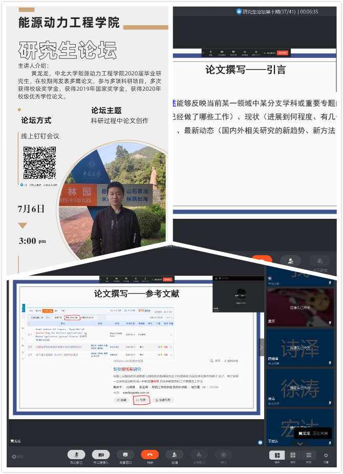 黄龙龙同学是我校2019年研究生国家奖学金的获得者,在校期间发表多篇高水平论文,参与多项科研项目,其学位论文被评为2020年校级优秀学位论文。现就职于四川绵阳中国空气动力学研究与发展中心。黄龙龙同学结合自己三年科研写作过程中遇到的问题,介绍了写论文的“六步法则”, 并为同学们总结了详细的写作经验与写作技巧,分享了自己写论文的情绪管理,让大家不要对论文写作抱有畏难情绪,鼓励大家放松心态着手去做。最后,面对同学们的热情提问,黄龙龙同学也耐心地为大家解答,线上研究生论坛在活跃的气氛中圆满结束。